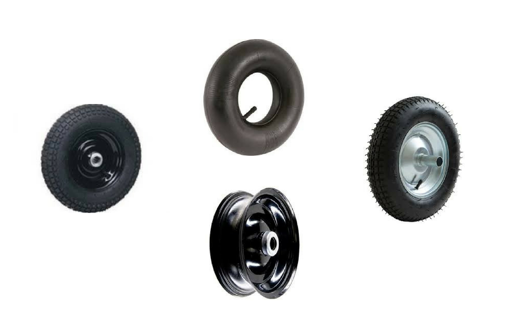 Ferragens, pneus e câmaras para carrinhos de mão e outros carrinhos industriais.