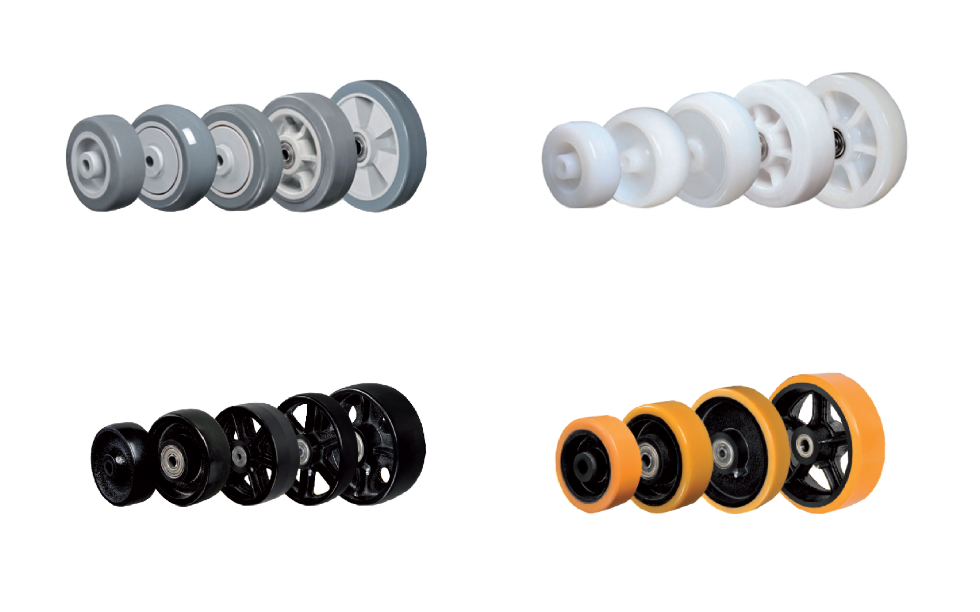 rodas de resina, nylon, ferro fundido, poliuretano, borracha