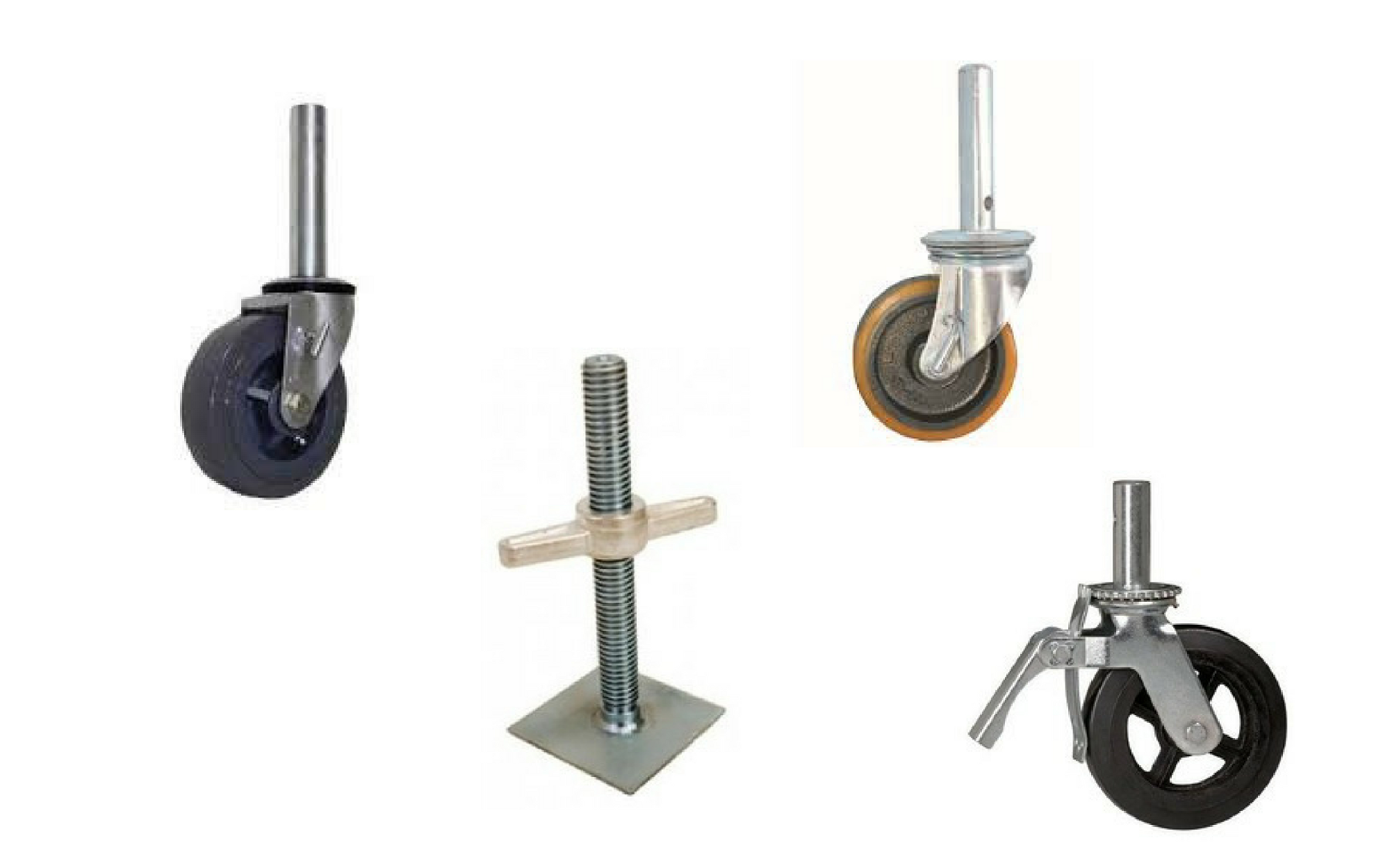 Sapatas e rodízios para andaimes com rodas de poliuretano e outros materiais.